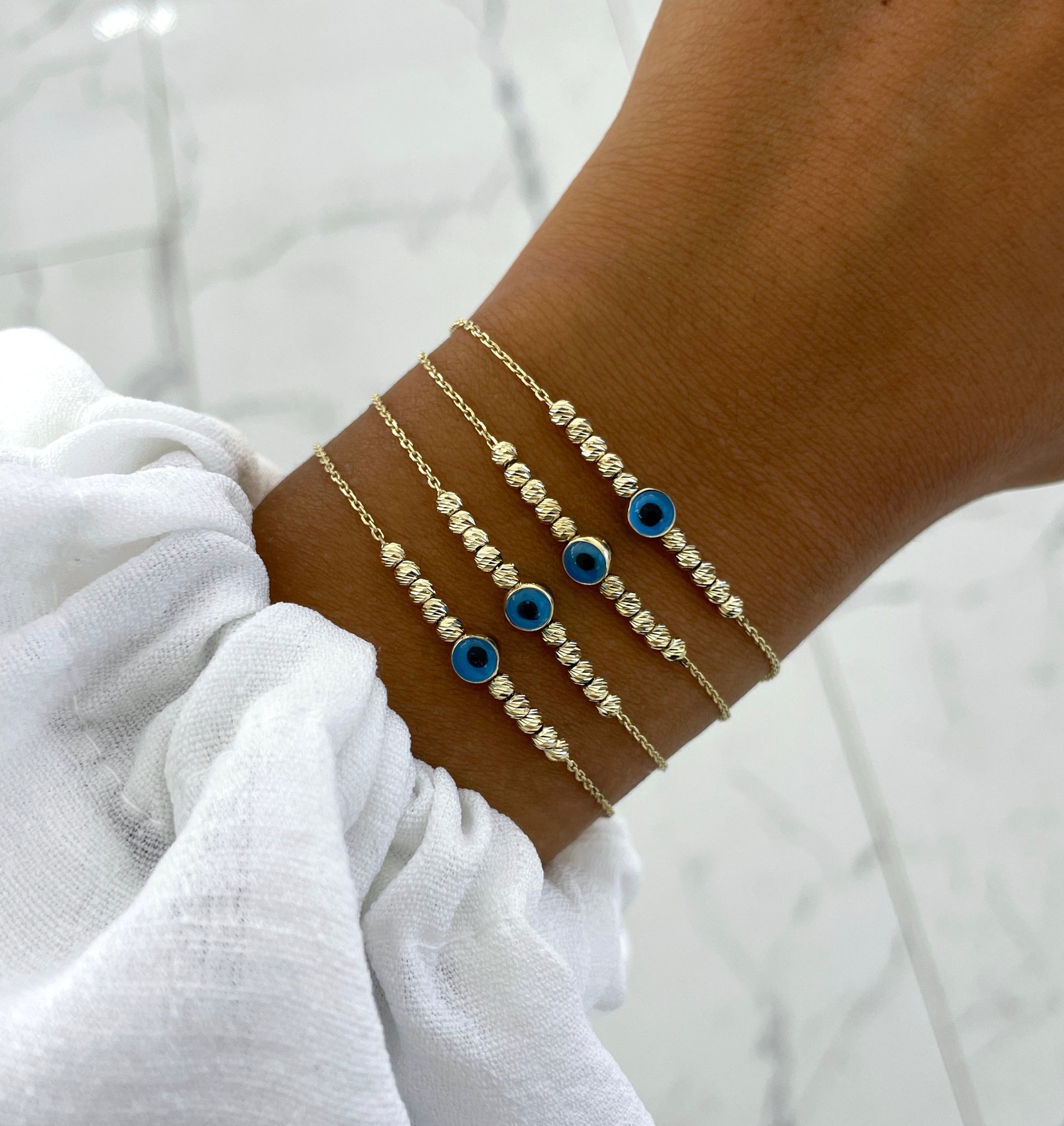 Das Blue Eye Diz Armband aus 585er Gelbgold passt sich Ihrem Arm perfekt an und verleiht Ihnen einen einzigartig luxuriösen Look. Stay stylisch mit den dorika Kugeln und dem verzaubernden Nazar Auge. Ein Armband, das Sie lieben werden.
