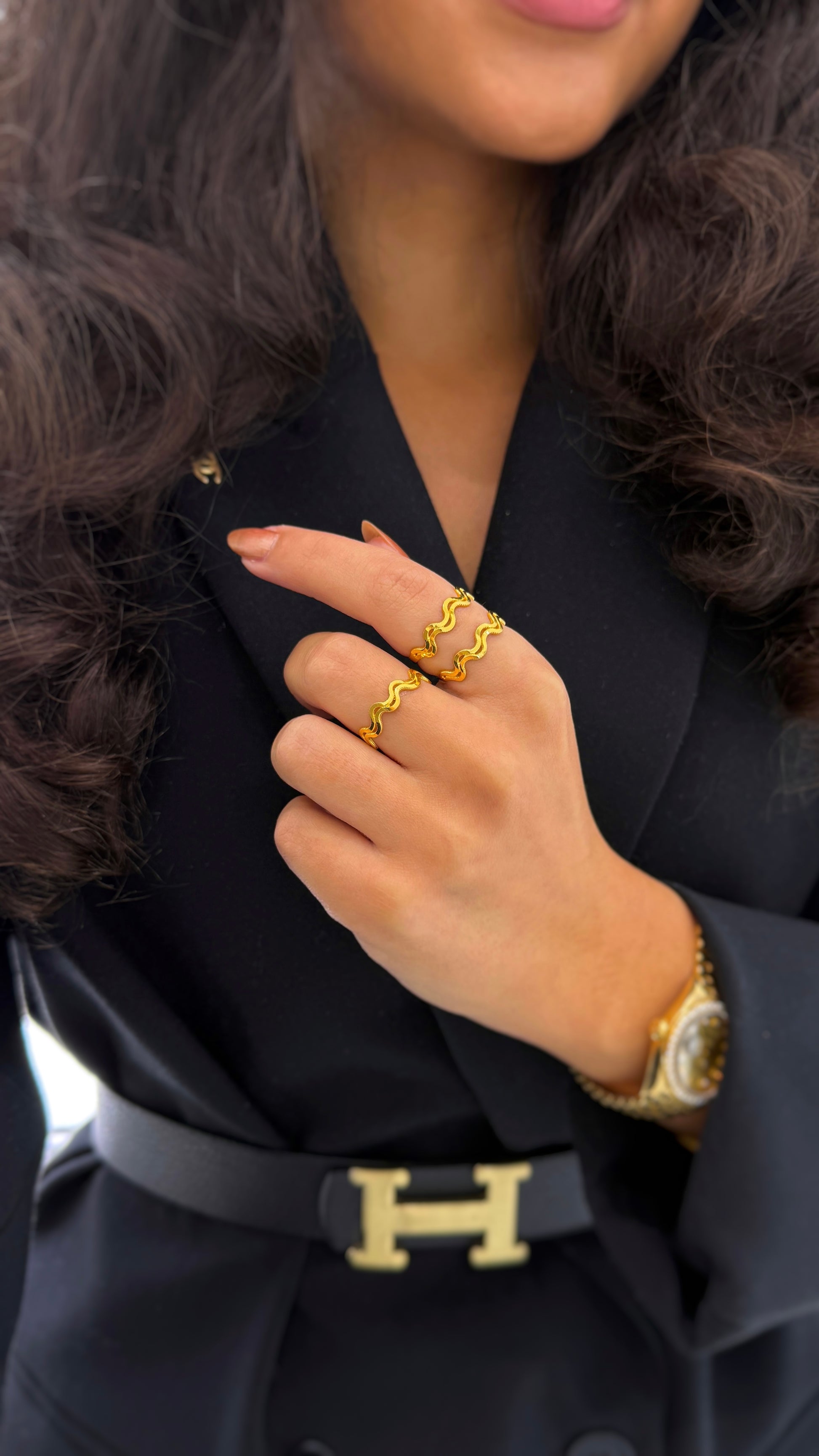 Dieser einzigartige Ring vereint zeitlose Eleganz mit modernem Design. Aus 14 Karat Gelbgold gefertigt, fließen seine doppelt geschwungenen Linien wie sanfte Wellen und symbolisieren Harmonie und Bewegung.