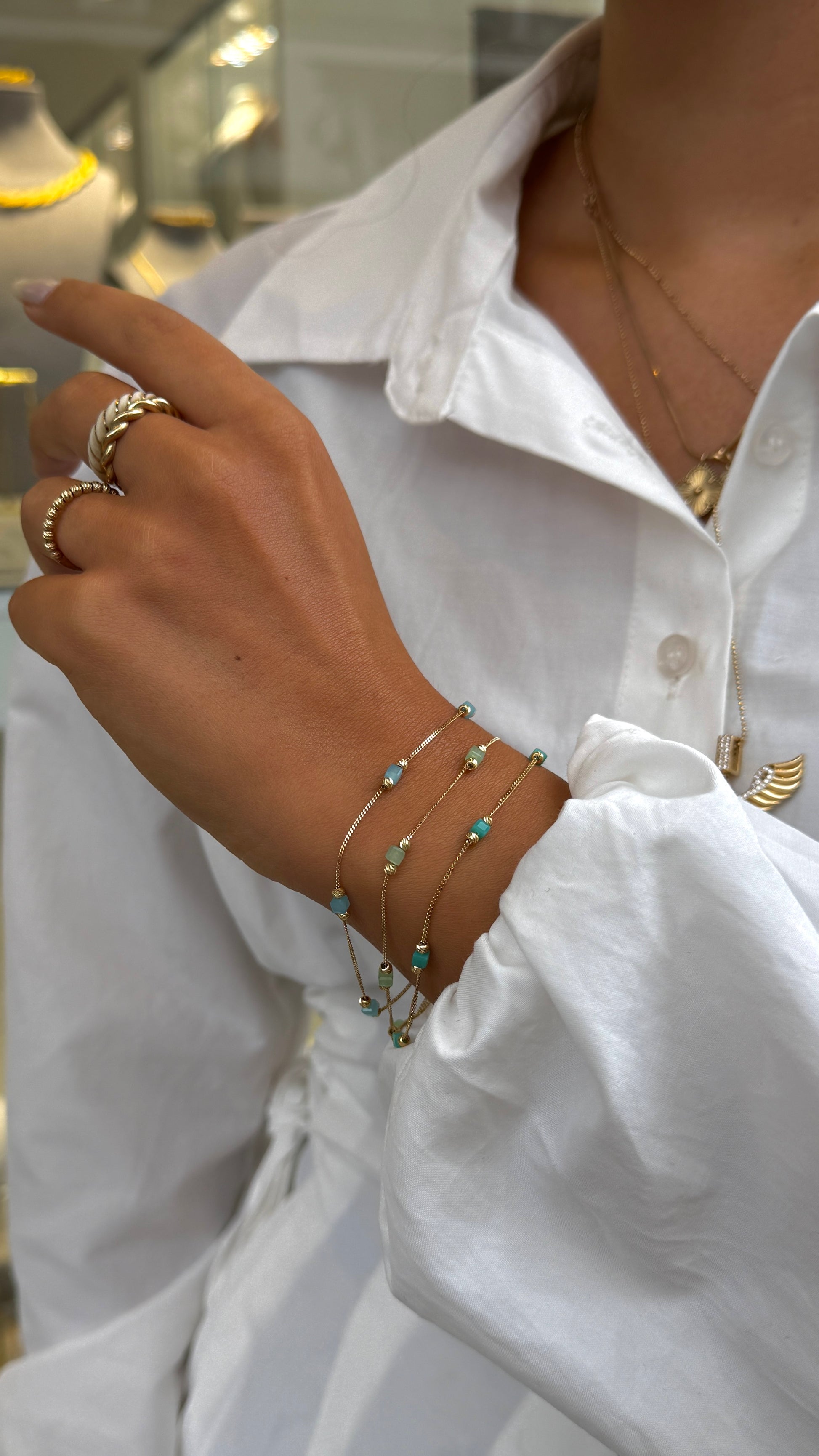 Die Cube Mint Armbänder sind der perfekte Sommer-Favorit. Die Kombination aus mint Blau und Grünen Steinchen sowie Dorika-Kugeln verleiht Ihrem Outfit eine erfrischende Note.