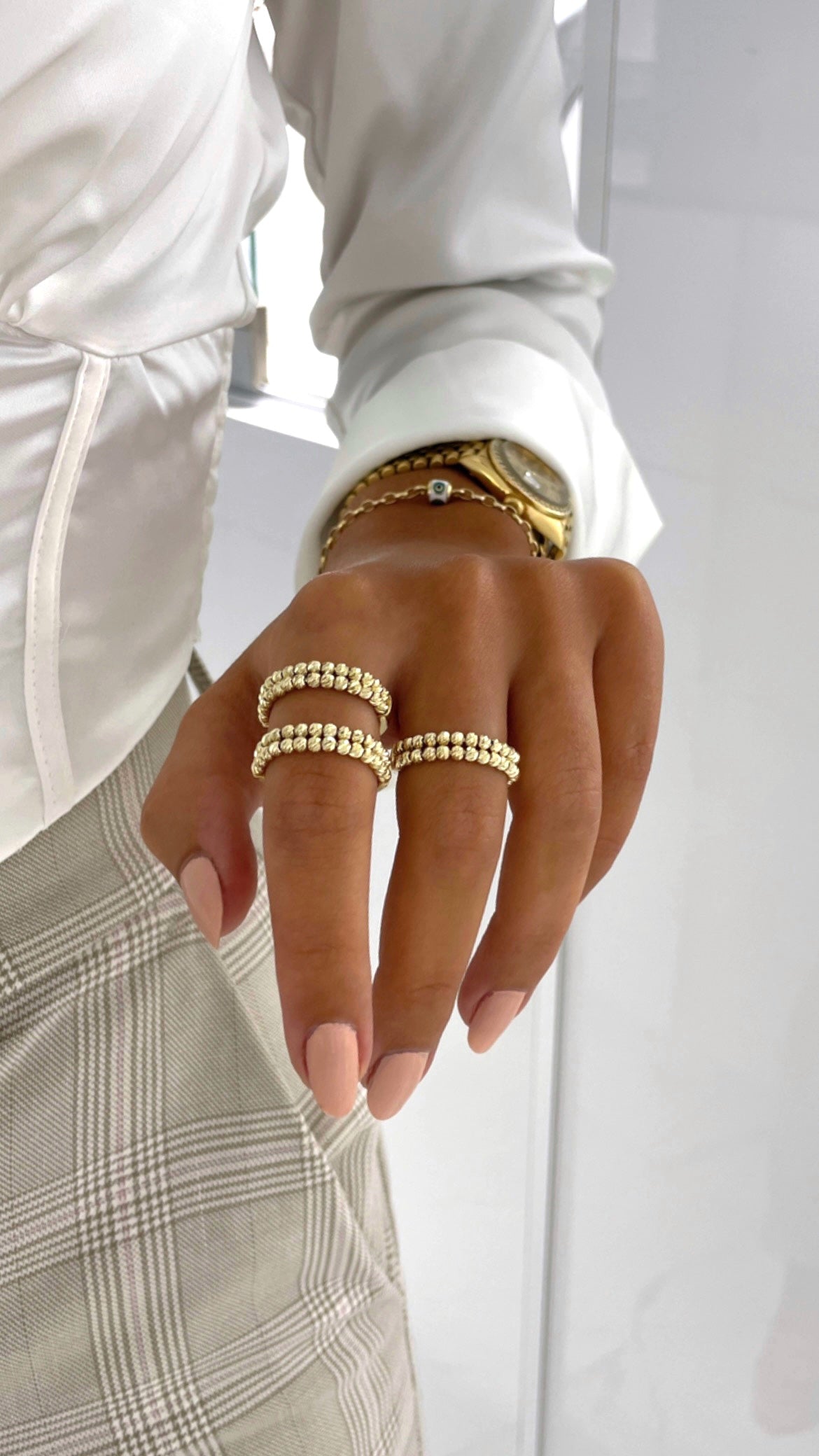 Der beeindruckende Dorika Double Ring besteht aus 585er Gelbgold und ist zweireihig mit funkelnden Dorika Kugeln veredelt. Er bringt ein langlebiges, kostbares Gefühl von Glamour und Eleganz in Ihren Look.
