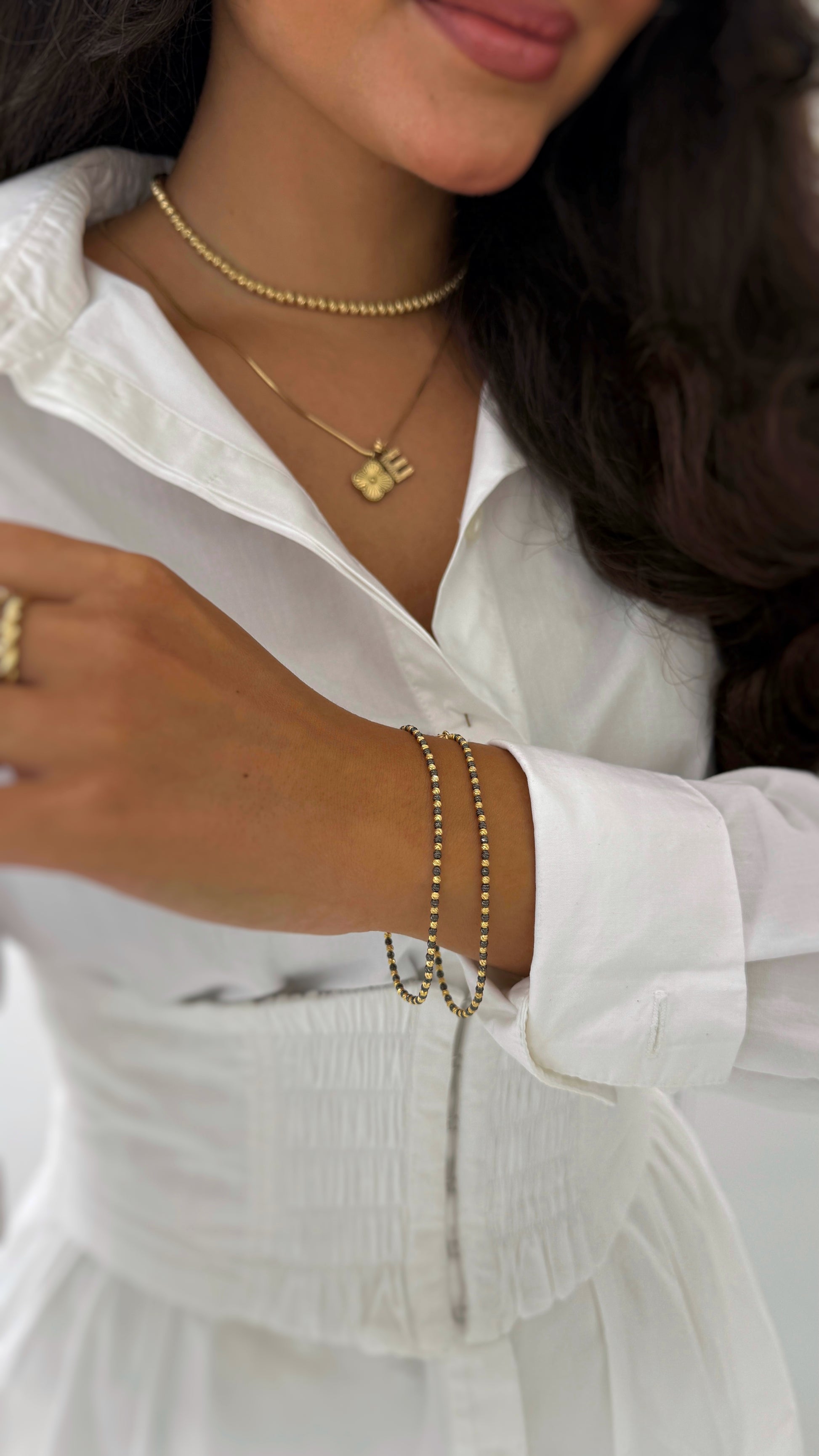 Entdecken Sie das neue Dorika Noir Armband aus hochwertigem 14 karat gelbgold, verziert mit eleganten schwarzen Kugeln. Das perfekte Accessoire für einen dezenten und stilvollen Look. Verpassen Sie nicht die Chance, dieses exklusive Schmuckstück zu besitzen.
