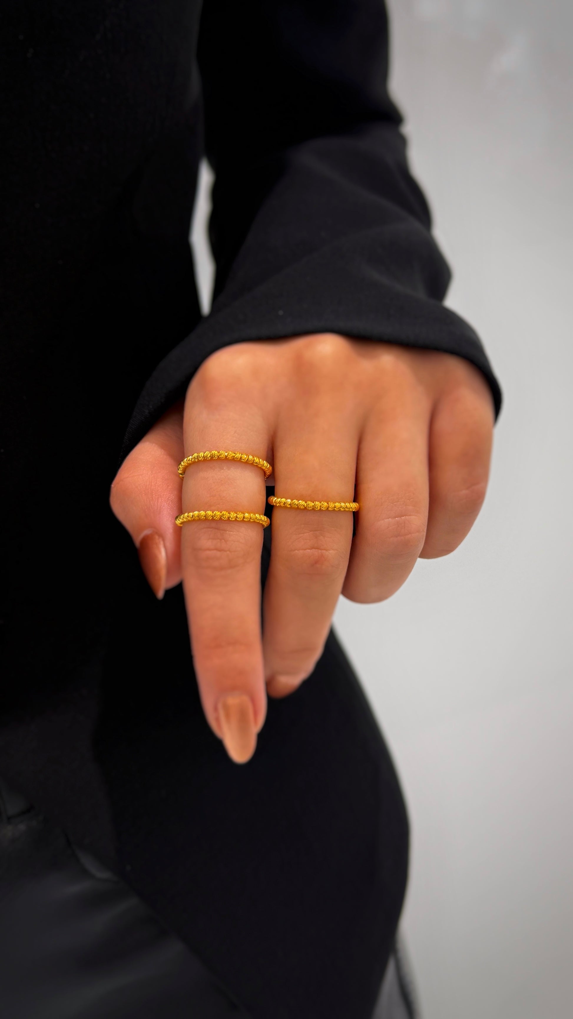 Die Oberfläche besteht aus vielen kleinen, funkelnden Kügelchen, die das Licht bei jeder Bewegung sanft reflektieren. Dadurch entsteht ein edler, subtiler Glanz, der den Ring besonders stilvoll wirken lässt, ohne aufdringlich zu sein.