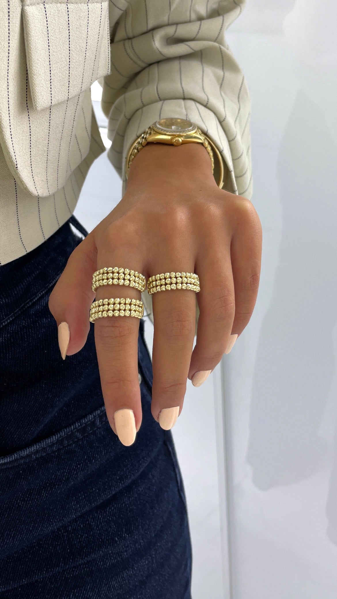 Dorika Tres, der dreireihige Ring aus 14 Karat Gelbgold, verleiht Ihnen einen eleganten und klassischen Look. Die drei Reihen sorgen für eine auffällige Optik und das hochwertige Material garantiert eine lange Haltbarkeit. Perfekt für jeden Anlass.