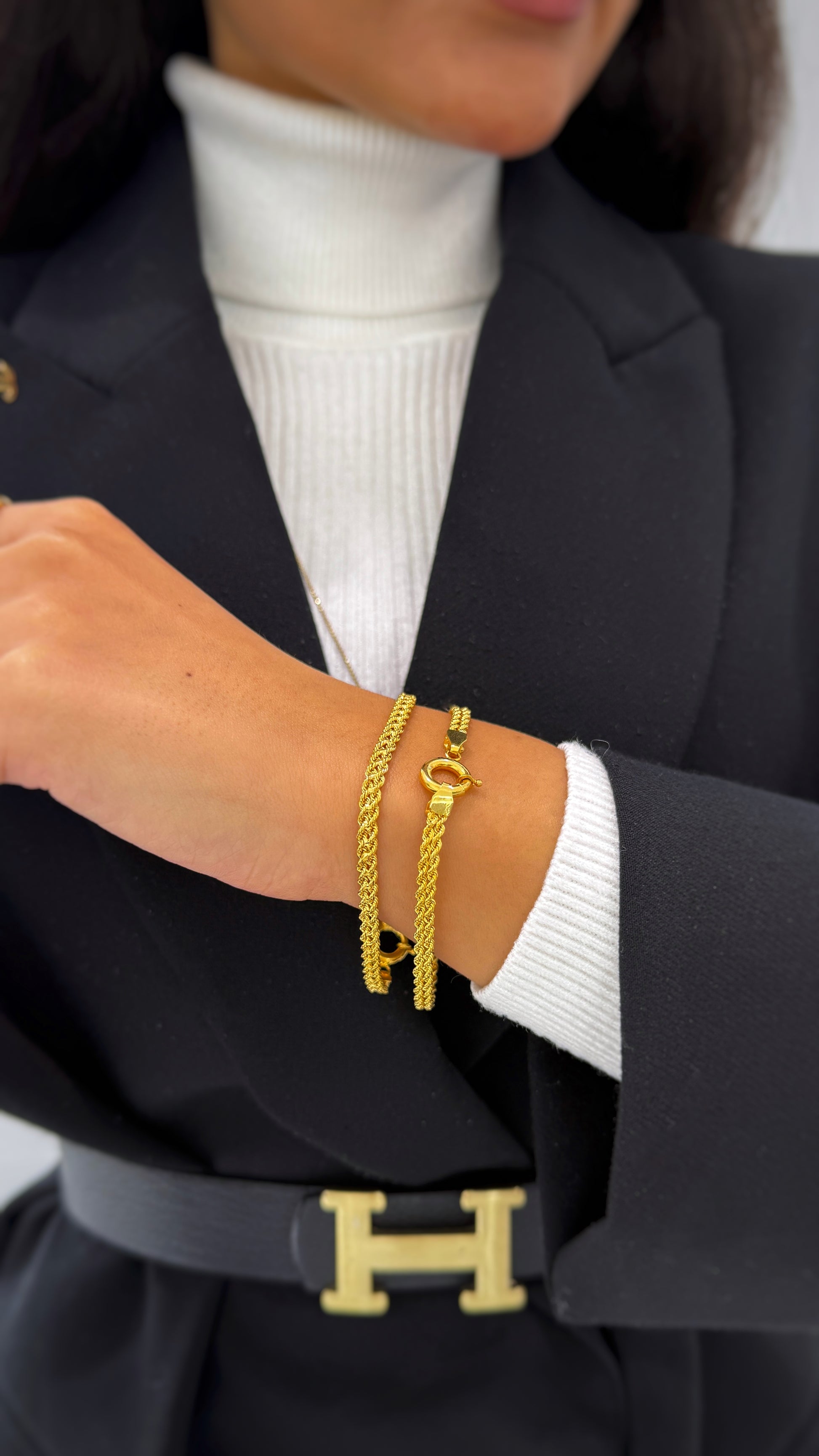 Gefertigt aus edlem 14 Karat Gold, schmiegt sich das Armband sanft an das Handgelenk und reflektiert das Licht mit jedem zarten Schwung.