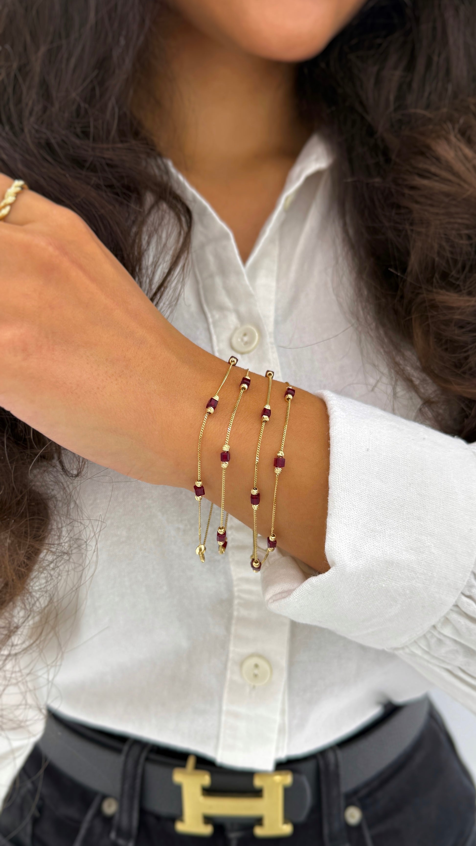 Lassen Sie sich von der Wärme des Herbstes verzaubern. Das Armband Sonbahar ruby aus 14 Karat Gold vereint zeitlose Eleganz mit der tiefen, leidenschaftlichen Farbe von Bordeaux. Inspiriert von den goldenen Blättern und der besonderen Stimmung der Herbsttage, bringt dieses Schmuckstück ein Gefühl von Wärme und Raffinesse an Ihr Handgelenk.