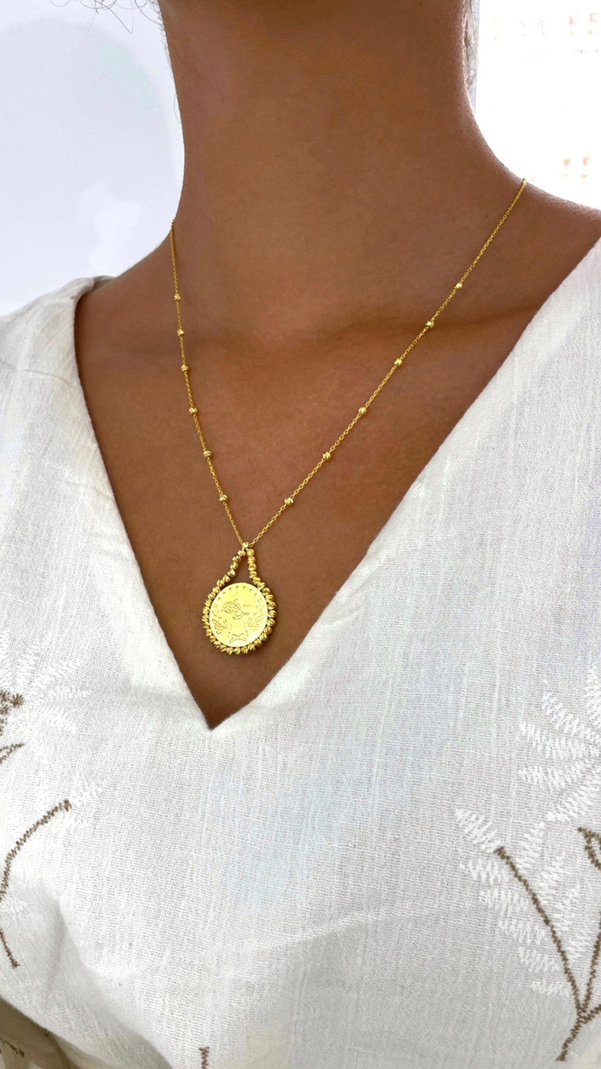 Das Tugra Drop Big Collier besteht aus 585er Gold und ist mit funkelnden Dorika Kügelchen sowie einem traditionellen Tropfen Design verziert. Dieses luxuriöse und zugleich zeitlose Schmuckstück ist ein echter Hingucker.