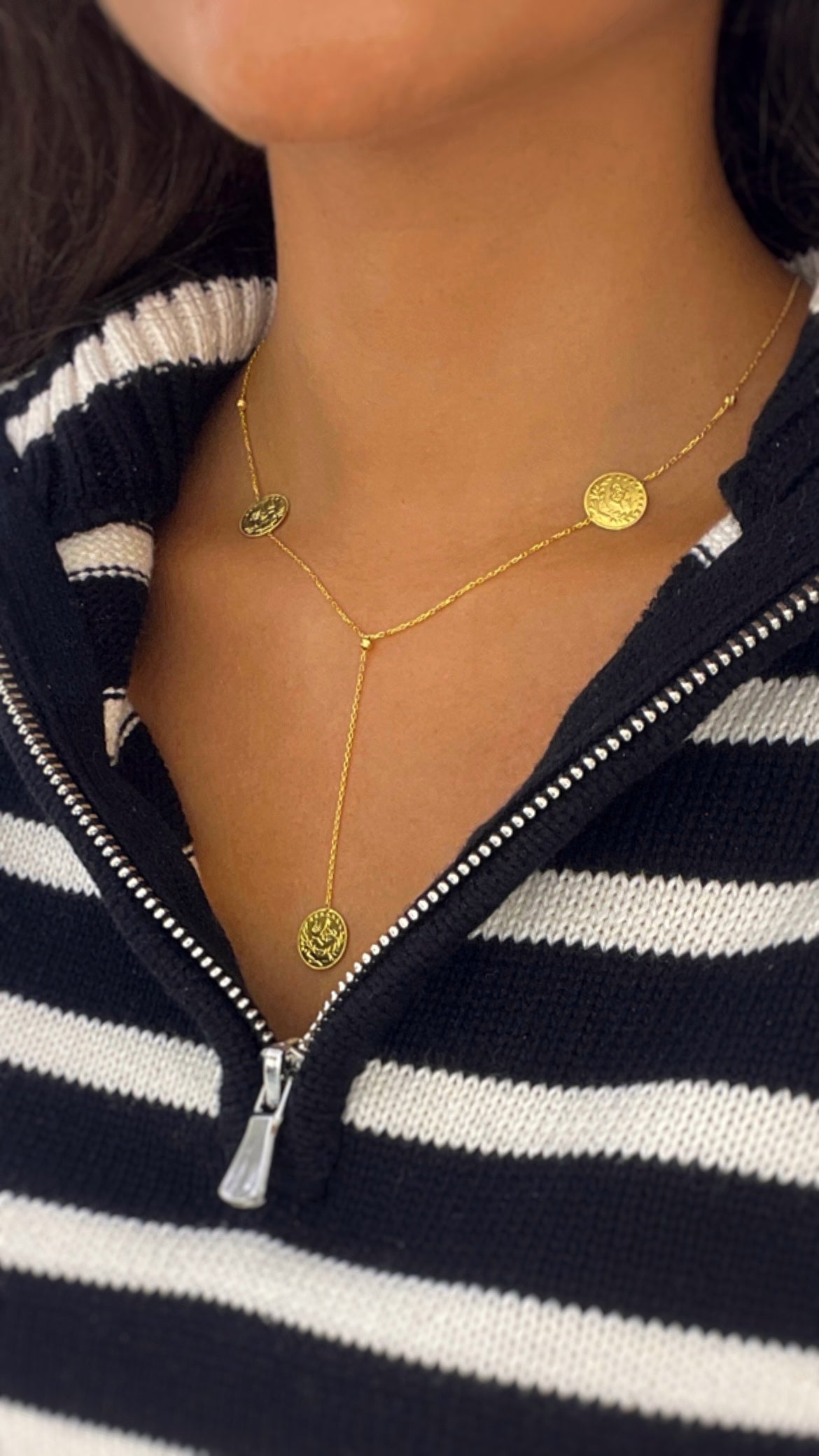 Tugra Feza Collier aus 585er Gelbgold vereint traditionelles und modernes Design. Es hat 3 tugra Symbole und dorika Kugeln, für ein schönes Schmuckstück. Erstklassige Verarbeitung und exquisite Schönheit machen dieses Collier zu einer ausgezeichneten Wahl.