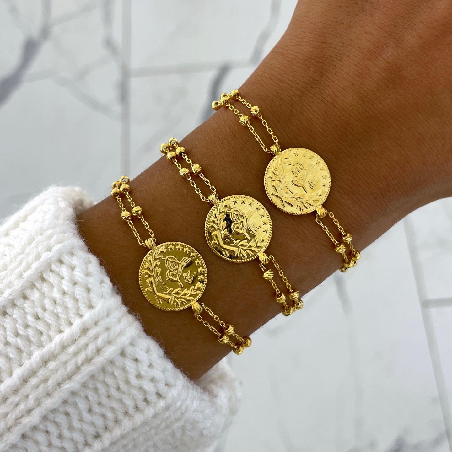 Tugra Sare ist ein elegantes Armband aus 14 Karat Gold, verziert mit einem Tugra und Dorika Kugeln. Mit seinem filigranen Design und hochwertigen Materialien ist es perfekt für jeden besonderen Anlass und verleiht jedem Outfit einen Hauch von Luxus. Ein zeitloses Accessoire, das in jeder Schmucksammlung nicht fehlen sollte.