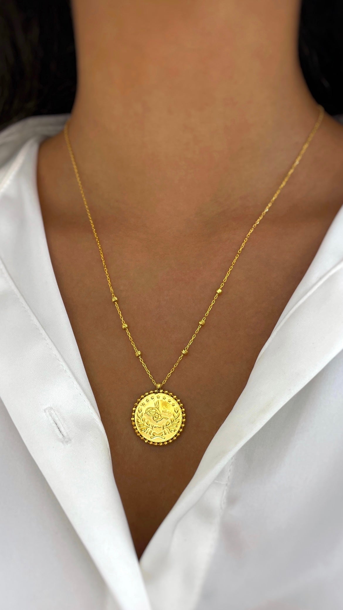 Tugra Zerde Collier aus 585er gelbgold, verziert mit Dorika Kugeln. Gönnen Sie sich dieses elegante Schmuckstück, das Ihrem Outfit einen Hauch von Luxus verleiht. Die hochwertigen Materialien und das edle Design machen dieses Collier zu einem zeitlosen Accessoire, das Sie immer wieder gerne tragen werden.