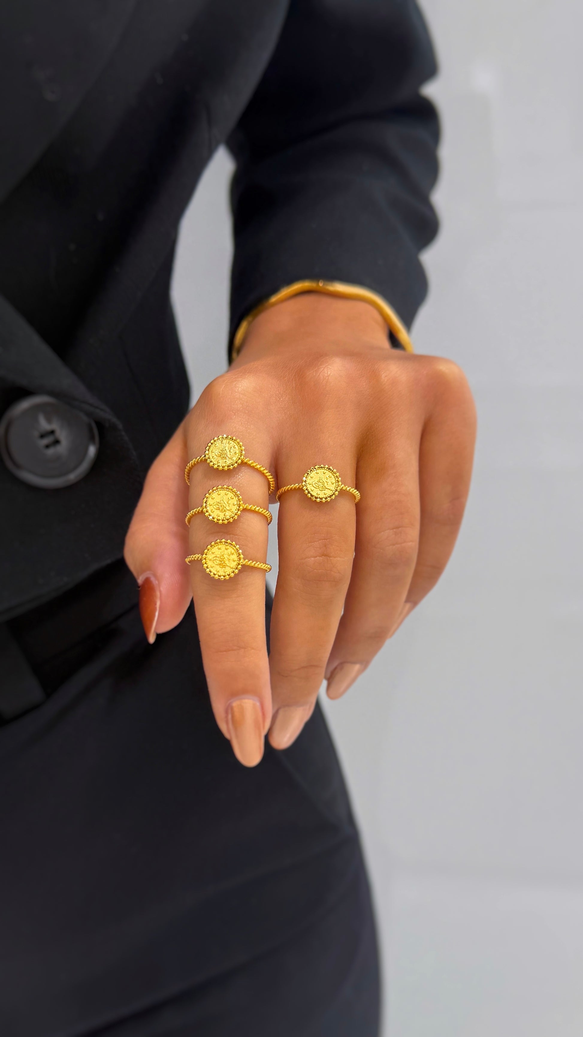 Dieser edle Ring aus 14 Karat Gelbgold verbindet traditionelle Eleganz mit modernem Feingefühl. Im Zentrum steht eine zarte, kleine Münze, deren dezente Struktur dem Schmuckstück eine dezidiert klassische Note verleiht. Umrahmt wird die Münze von einer feinen Linie aus winzigen, funkelnden Kügelchen, die dem Ring eine außergewöhnliche Raffinesse und lebendige Textur schenken.