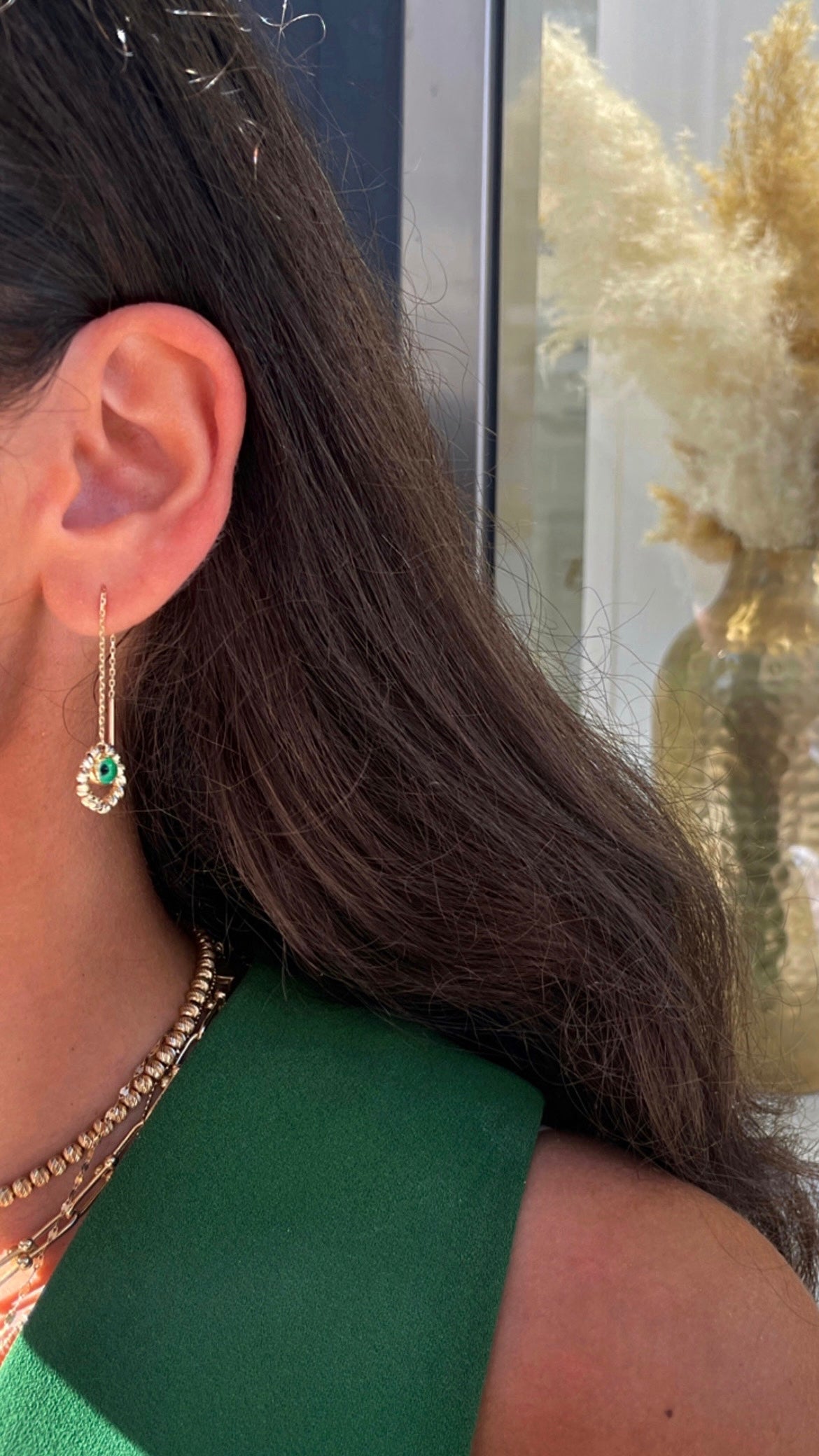 Der Circle Green Eye ist ein schicker Kettenohrring, der aus 585er Gelbgold gefertigt ist. Er besteht aus Dorika Kugeln und einem grünen Nazar-Anhänger, der ein Symbol für Schutz und Glück ist. Profitieren Sie von seiner luxuriösen Eleganz und seiner symbolischen Bedeutung.